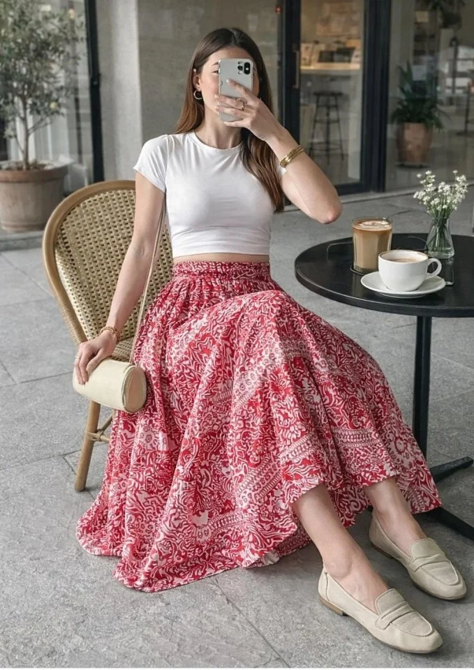 Kadın Yüksek Bel Etnik Desen Baskılı Beli Lastikliastarlı Etek
