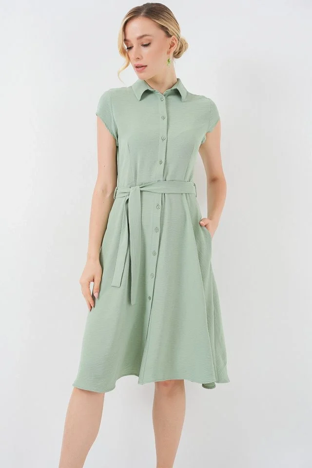 1677 Boydan Düğmeli Kuşaklı Elbise - E.Yeşil