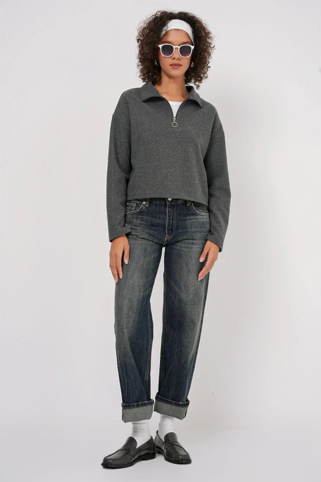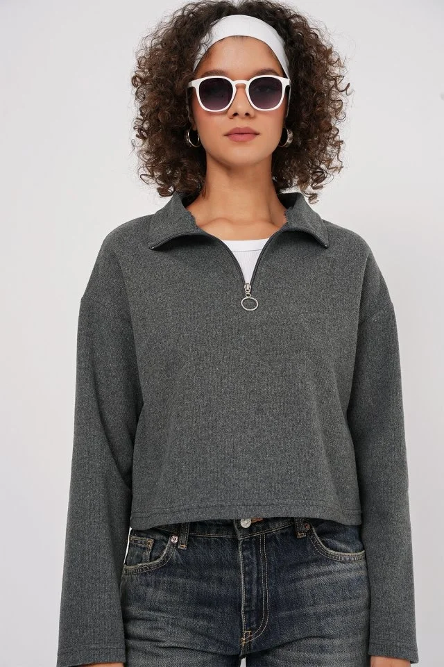 55449 Fermuarlı Yaka Örme Sweatshirt - Antrasit
