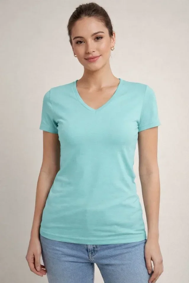 T-Shirt V Yaka Slim Fit Likralı Tişört Günlük Basic Body - Turkuvaz