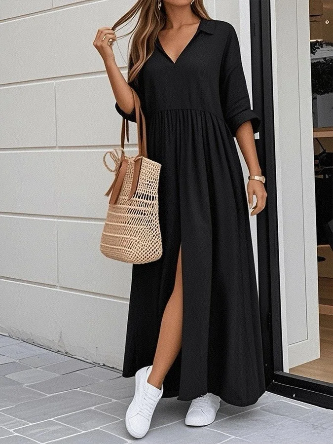 Kadın Truvakar Kollu Bisiklet Yaka Kemersiz Yırtmaç Detaylı Uzun Ithal Krep Elbise