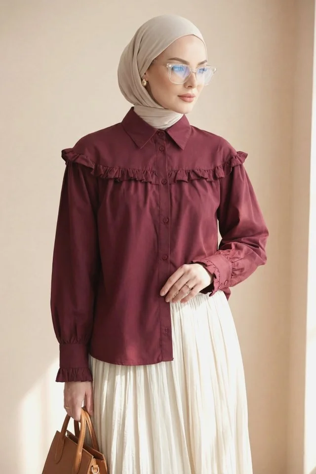 Fırfır Detaylı Düğmeli Kısa Gömlek -Bordo
