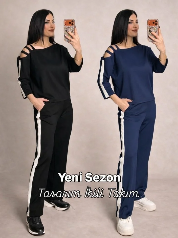 Kadın Yarasa Kol Yanları şerit Detay Modal Kumaş Ikili Takım