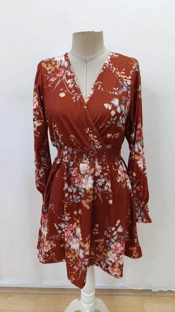 Kadın Uzun Kollu Kruvaze Yakalı çiçek Desenli Mini Süprem Elbise