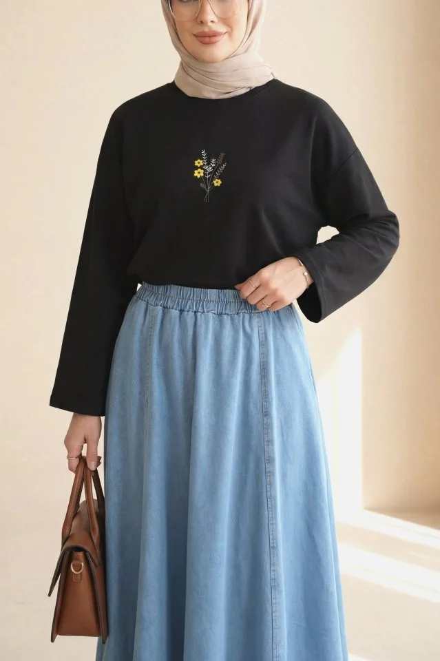 Önü Çiçek Nakışlı Yuvarlak Yaka Salaş Penye Tunik -Siyah