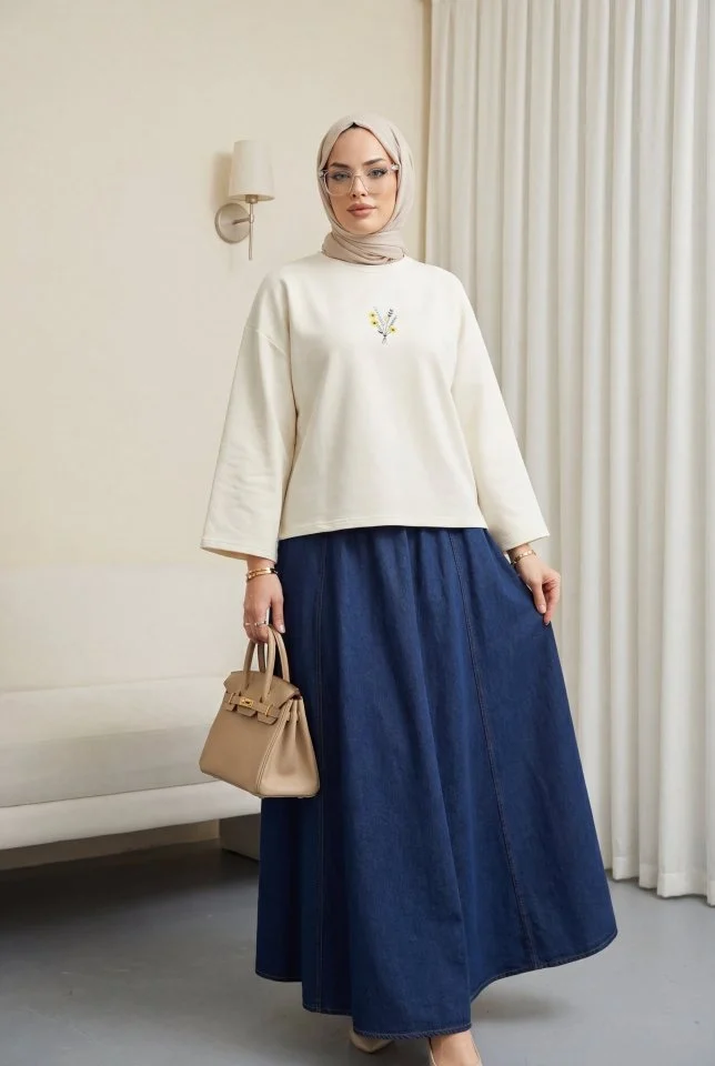 Önü Çiçek Nakışlı Yuvarlak Yaka Salaş Penye Tunik -Ekru