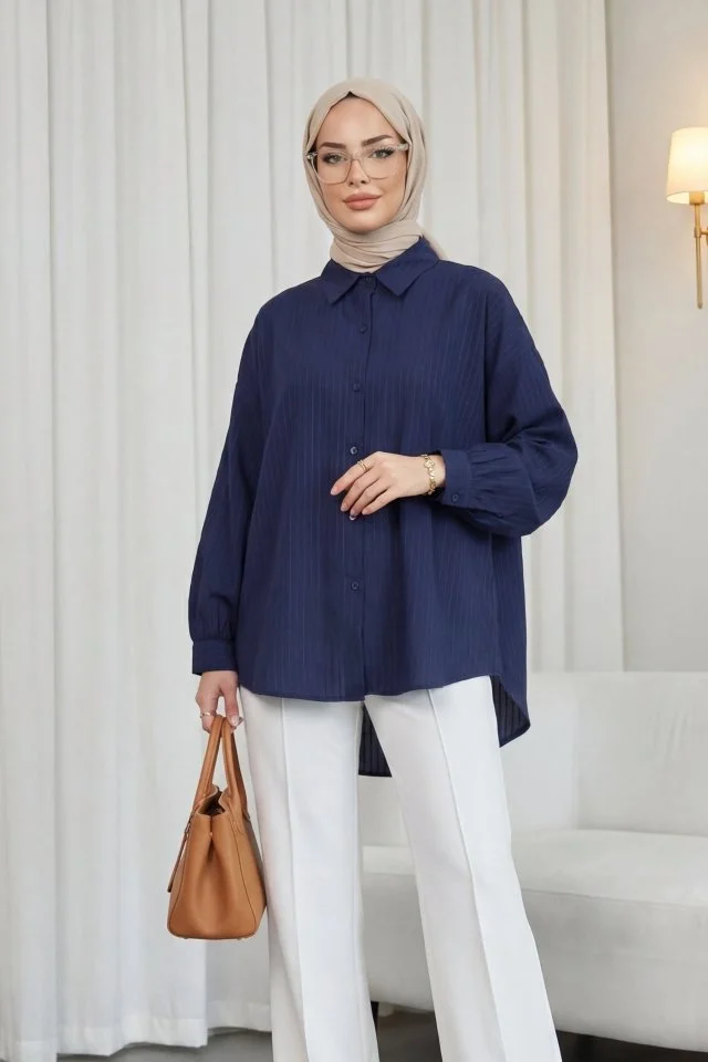 Arkası Uzun Çizgi Desenli Düğmeli Salaş Gömlek -Laci