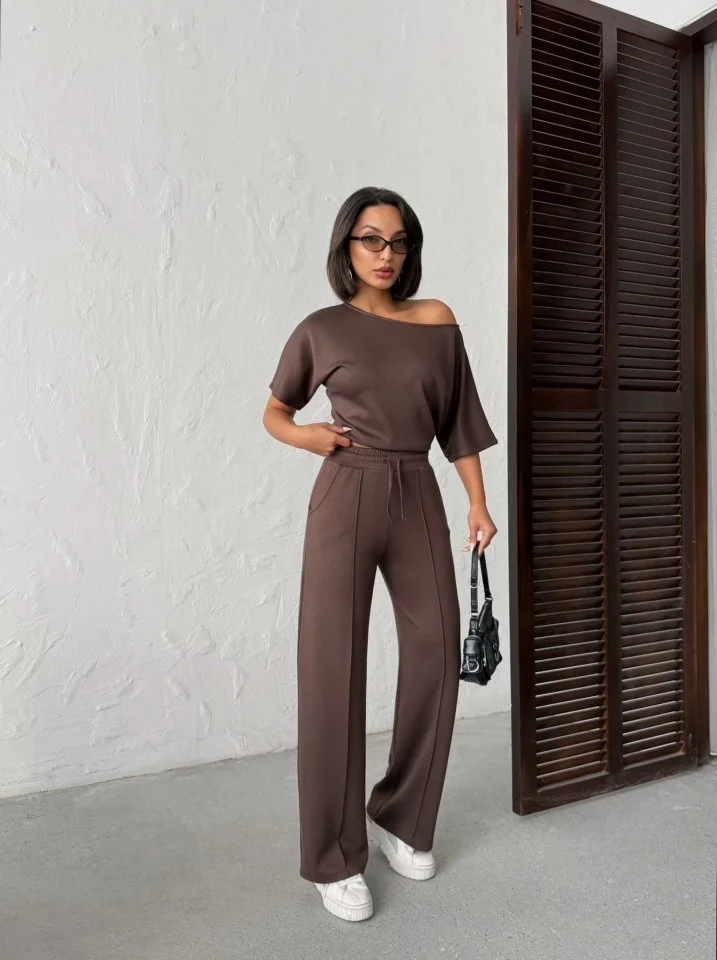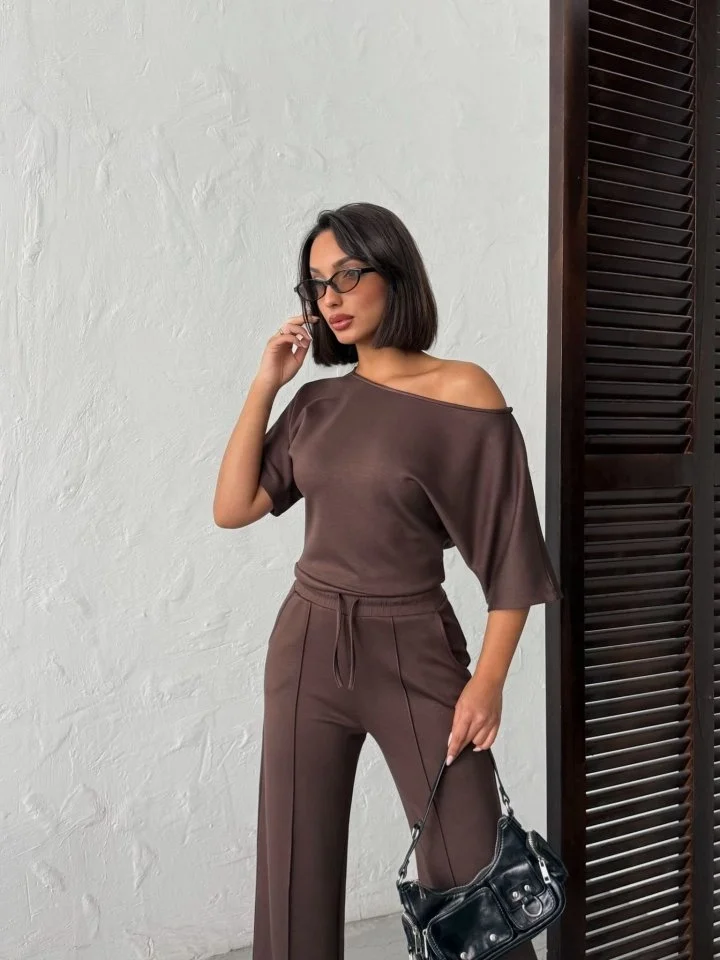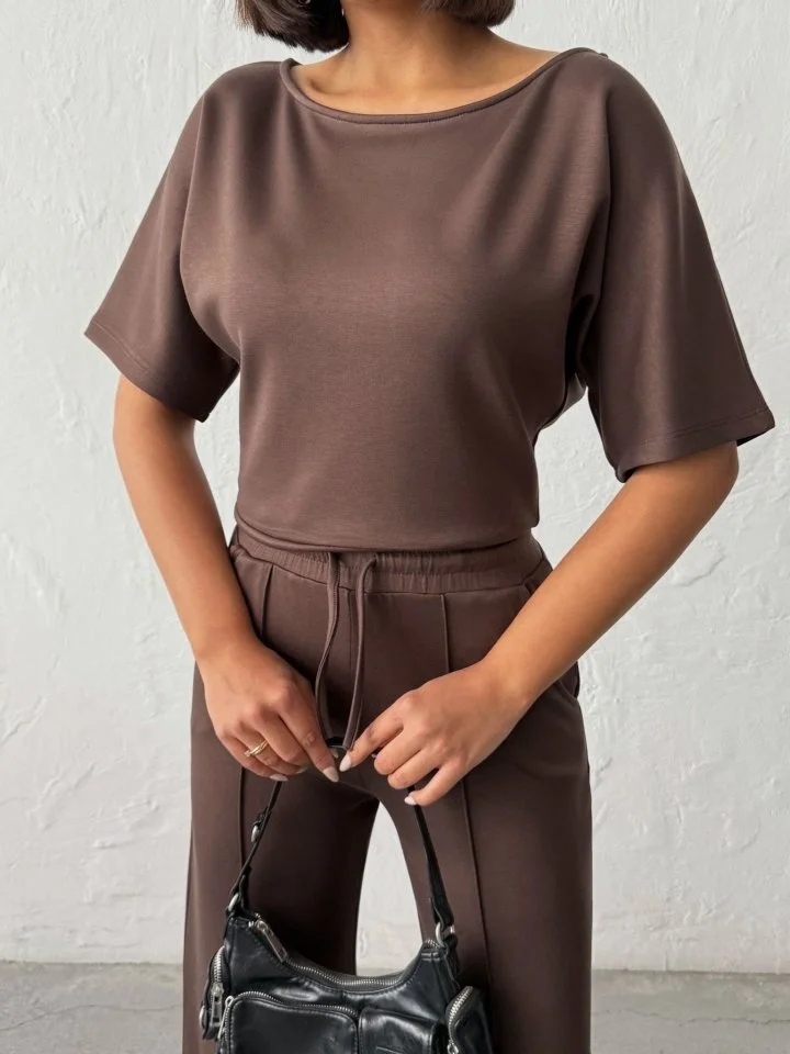 Kadın İsa Kollu Kayık Yaka Bluz Ve Pantolon Misal Kumaş Ikili Takım