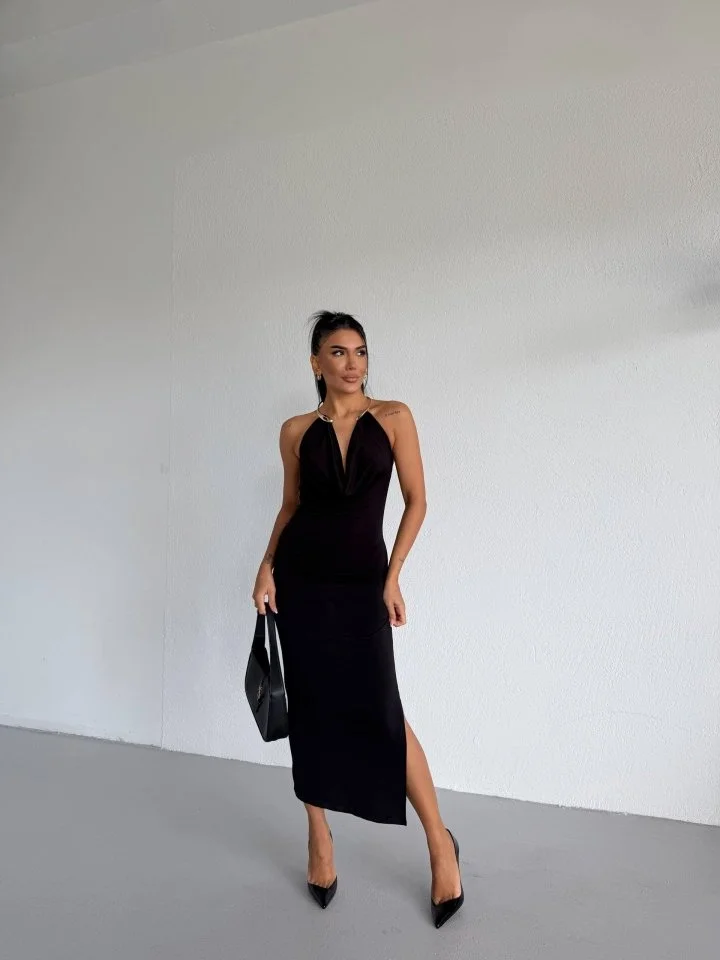 Kadın Boyun Aksesuarlı Halter Yaka Maxi Boy Sandy Kumaş Elbise