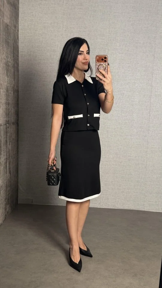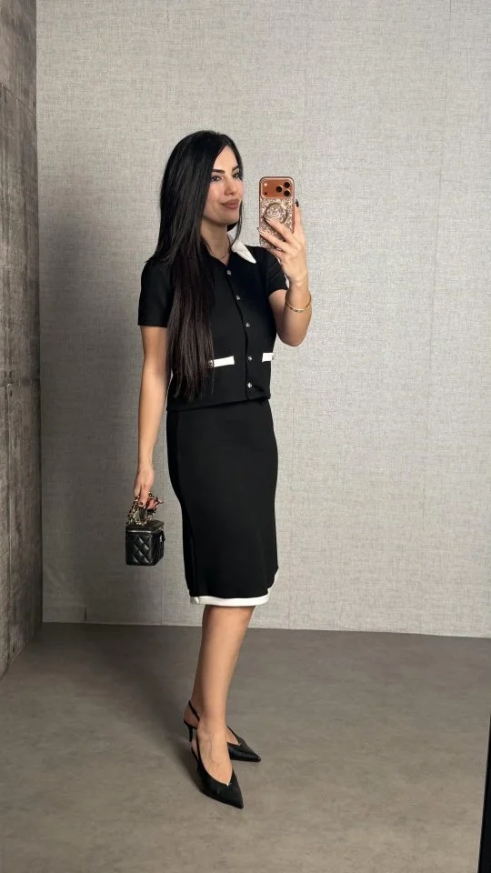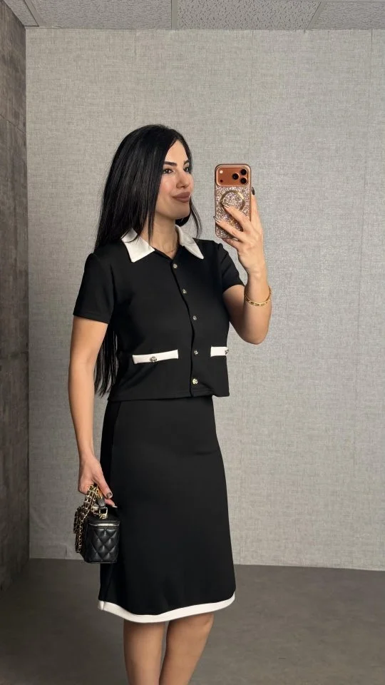 Kadın Kısa Kollu Cep Ve Düğme Detay Ceket Ve Diz üstü Etek Ikili Takım