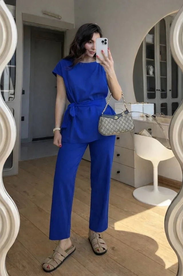 Kadın Omuz Detay Kuşak Dahil Bluz Ve Pantolon Keten Kumaş Ikili Takım