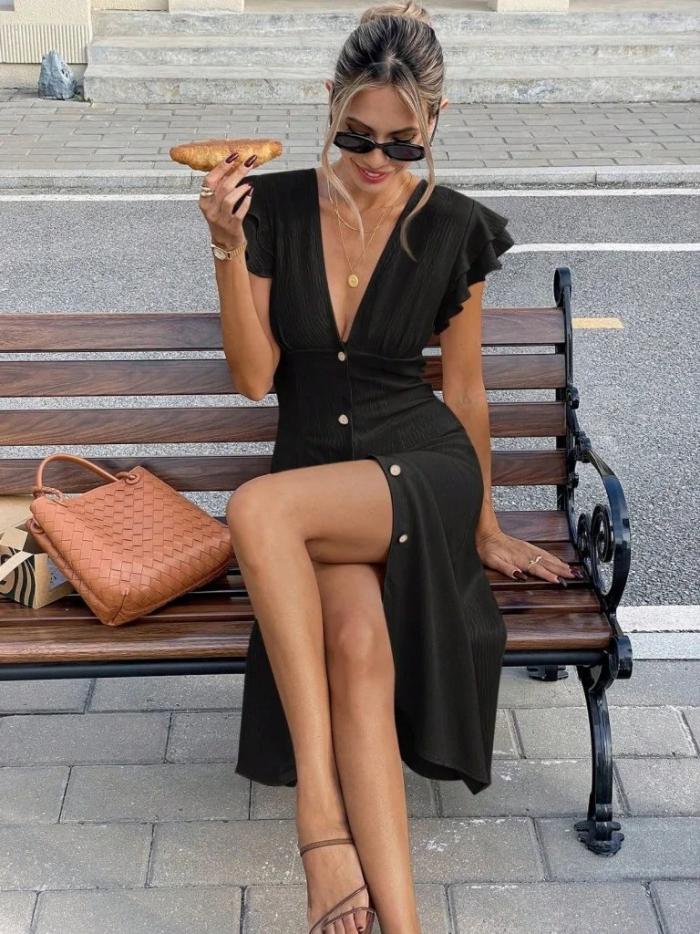 Siyah Yırtmaçlı Volanlı Elbise