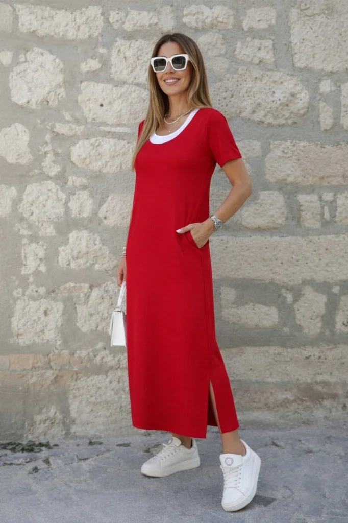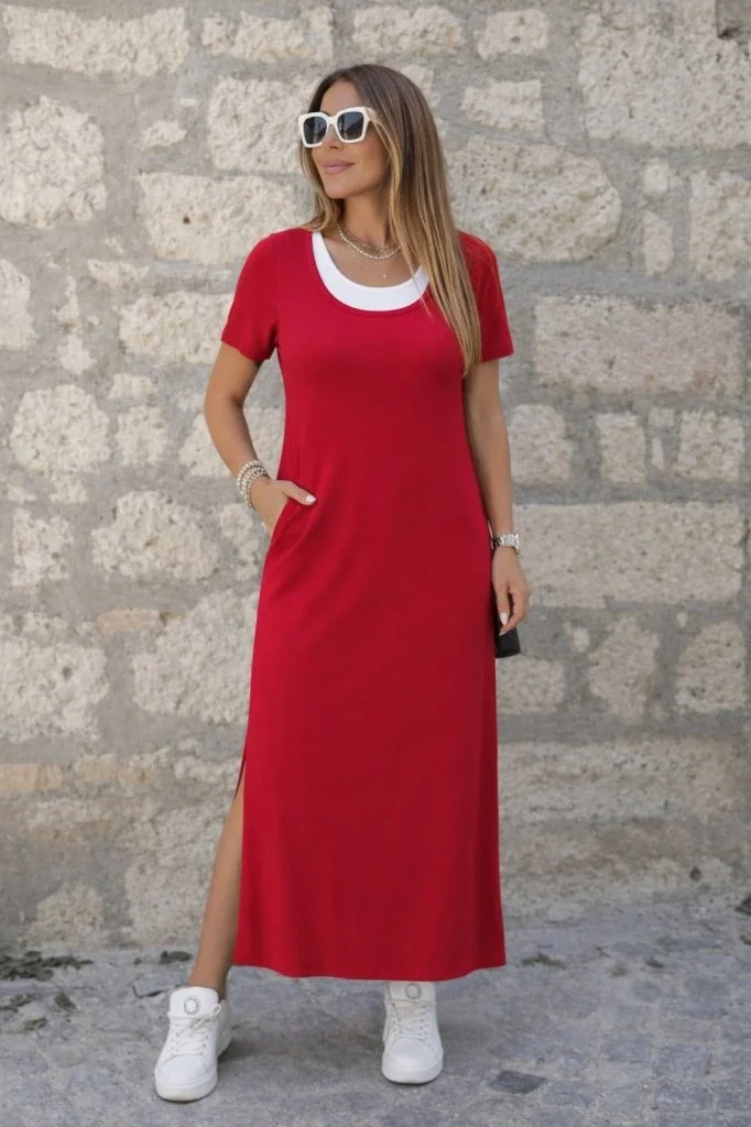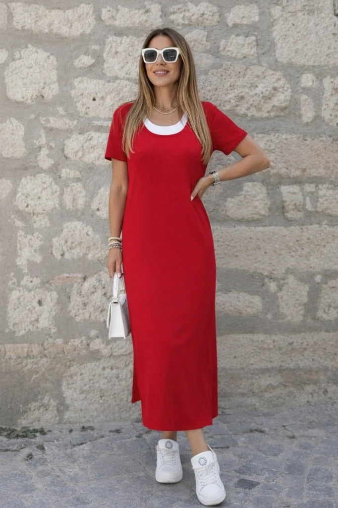 Kadın Kısa Kollu Içi Atlet Görünümlü Yandan Yırtmaçlı Uzun Viskon Elbise