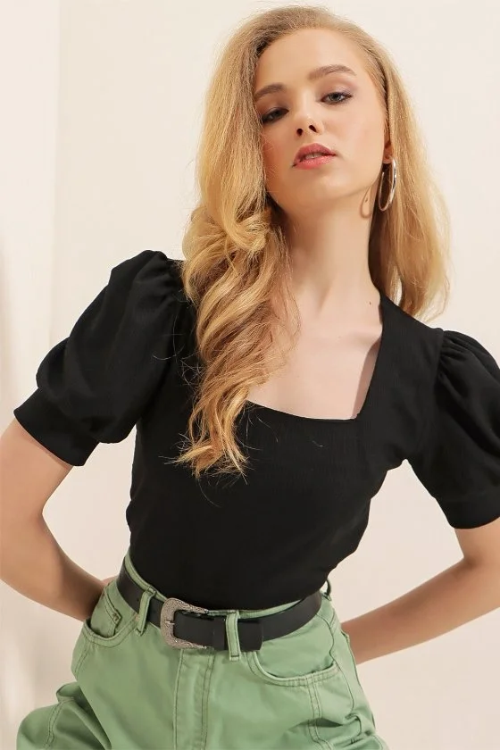 0409 Kare Yaka Örme Bluz - Siyah
