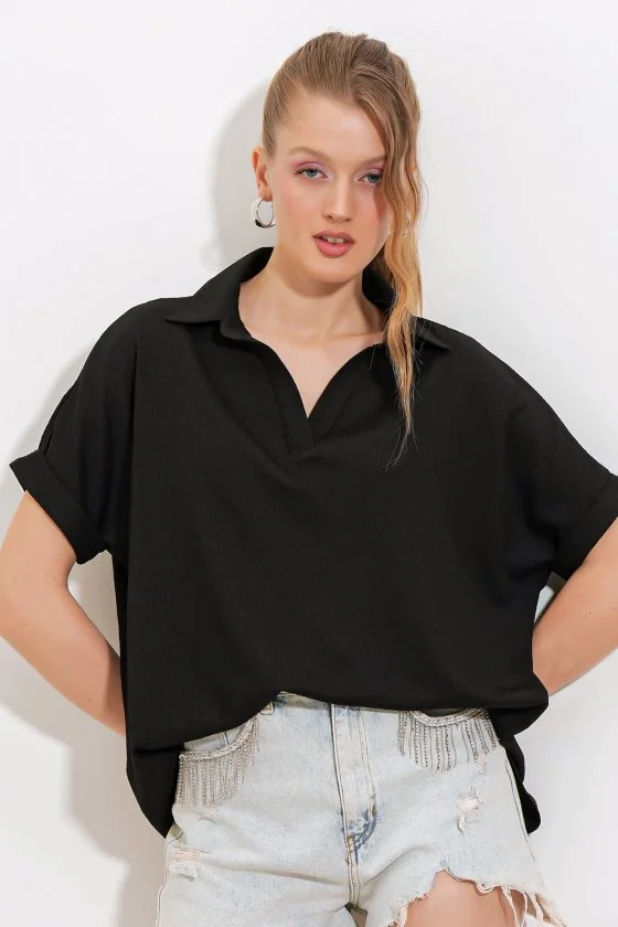 Siyah Oversize Polo Yaka Örme Bluz 0486
