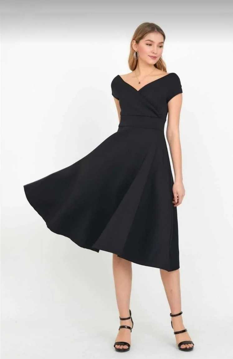 Düşük Omuz Eteği Pileli Krep Kumaş Midi Boy Elbise