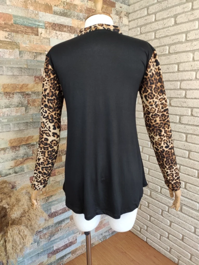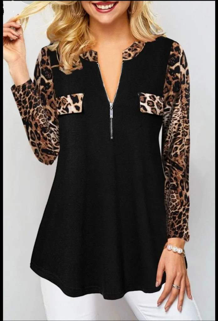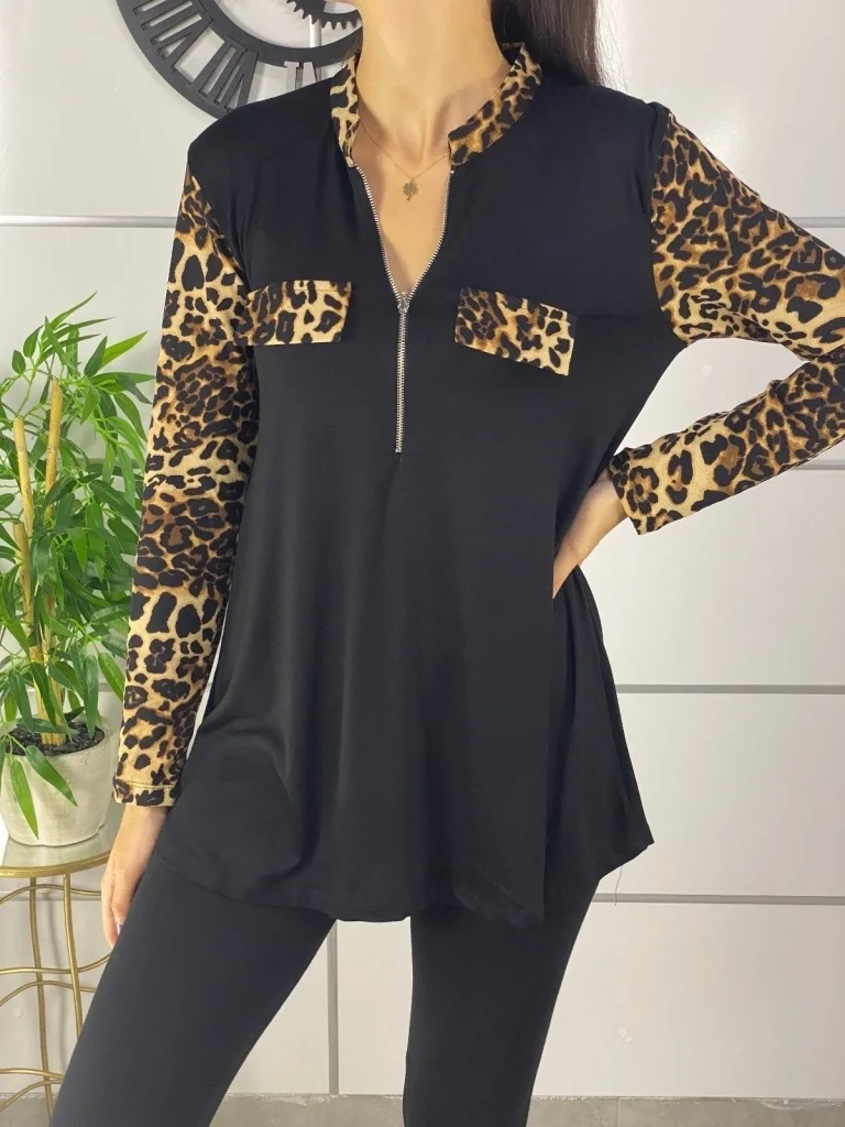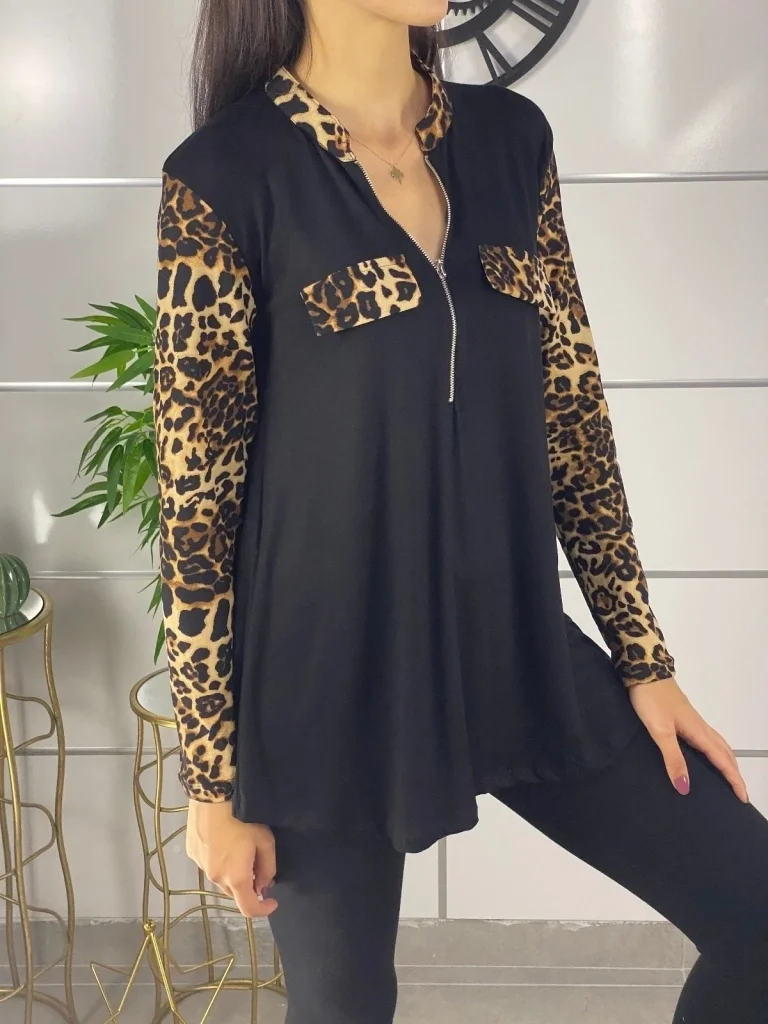 Kadın Leopar Desen Fermuar Detay Viskon Kumaş Bluz