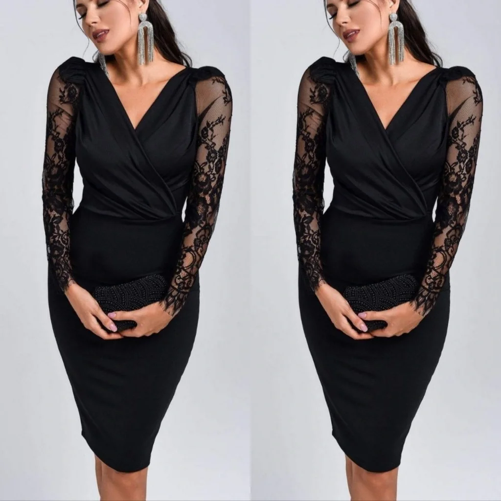 Kadın Uzun Kollu Kruvaze Yaka Kollar Tül Detay Ithal Krep Mini Boy Elbise
