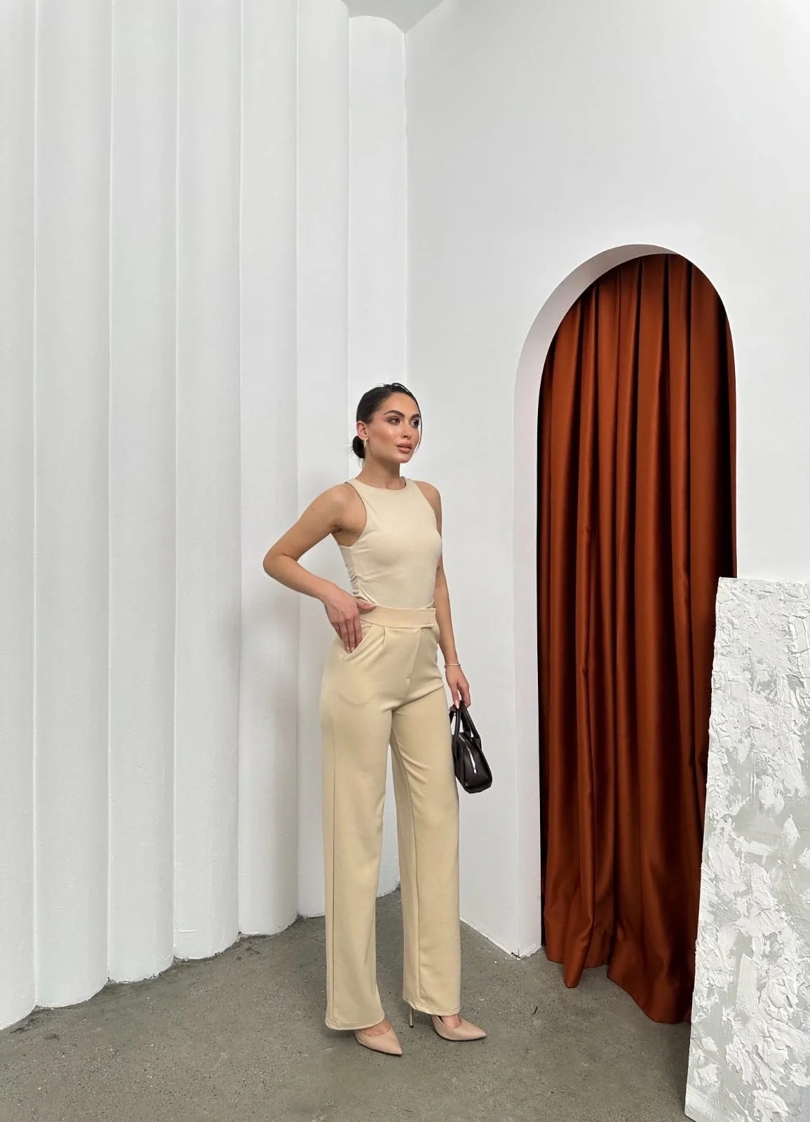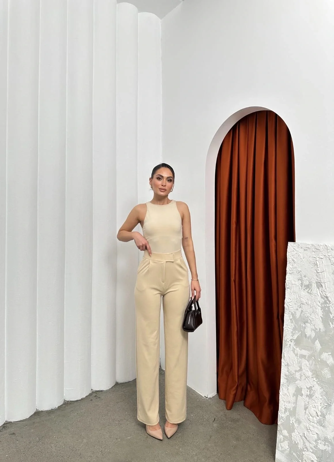 Şık ve rahat tasarımıyla dikkat çeken Krep Bej Cırtlı Pantolon, gardırobunuzun vazgeçilmez parçası olmaya aday!
