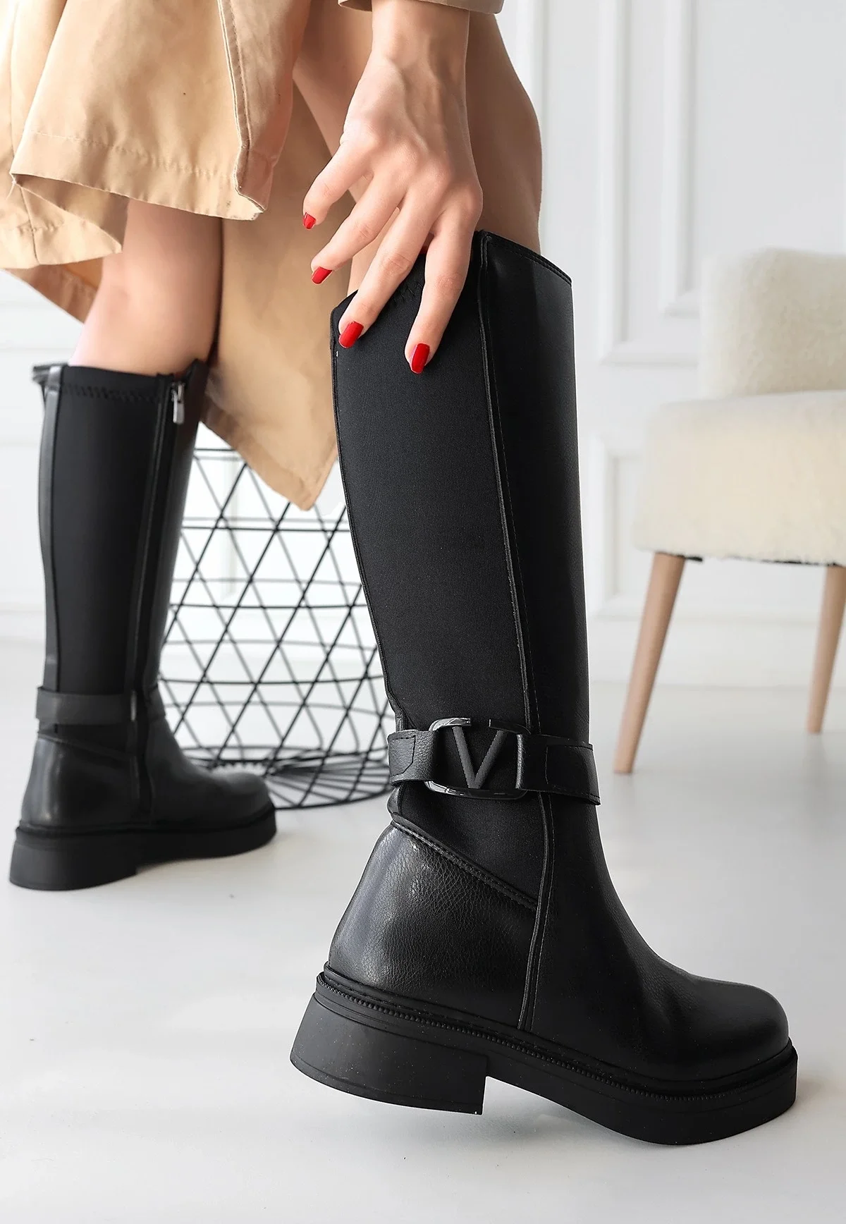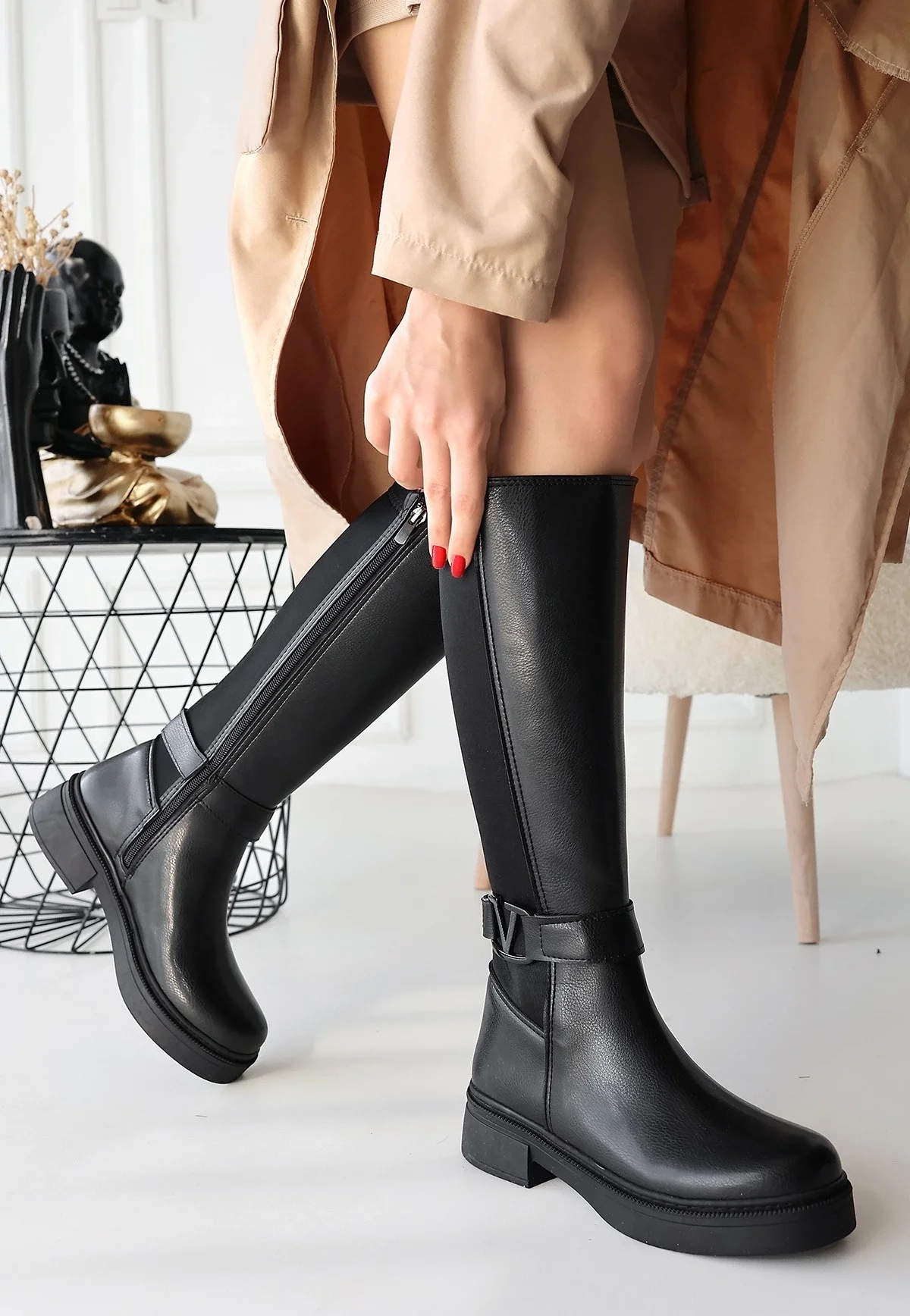Detay: Topuklu Yandan Fermuarlı Diz Altı Çizme