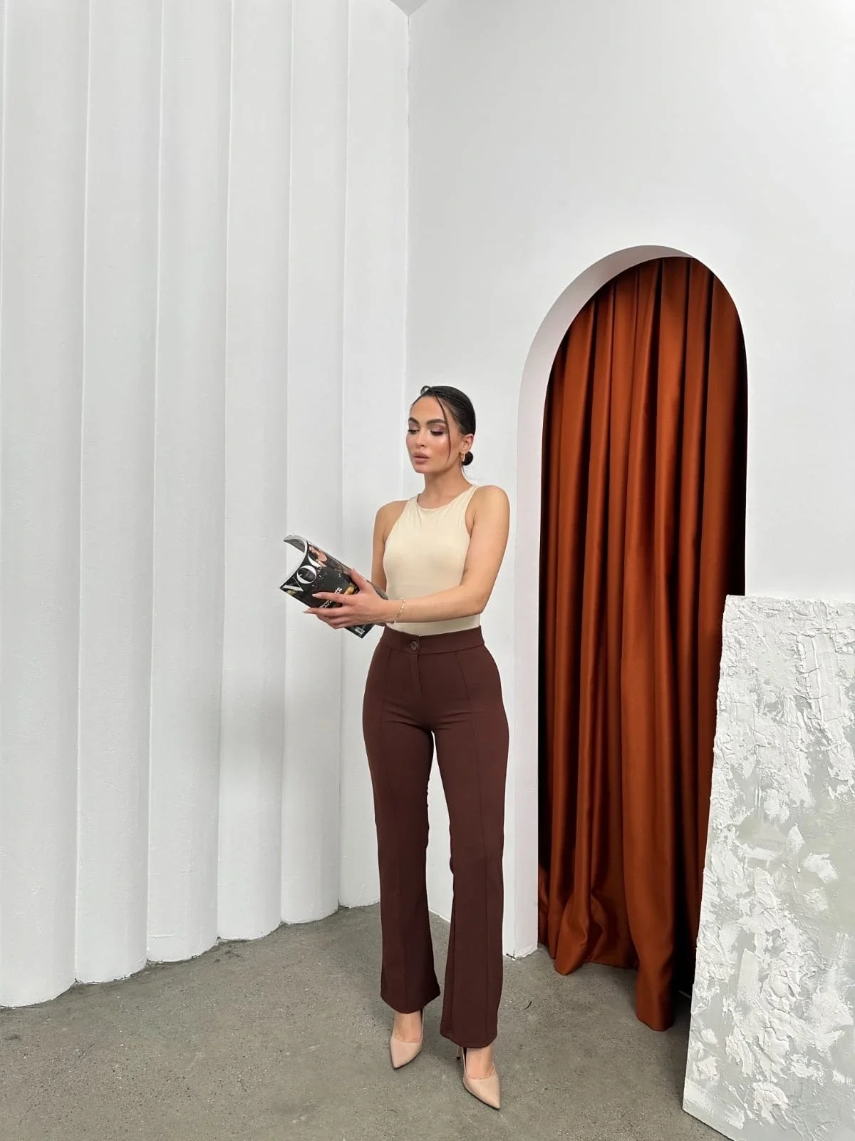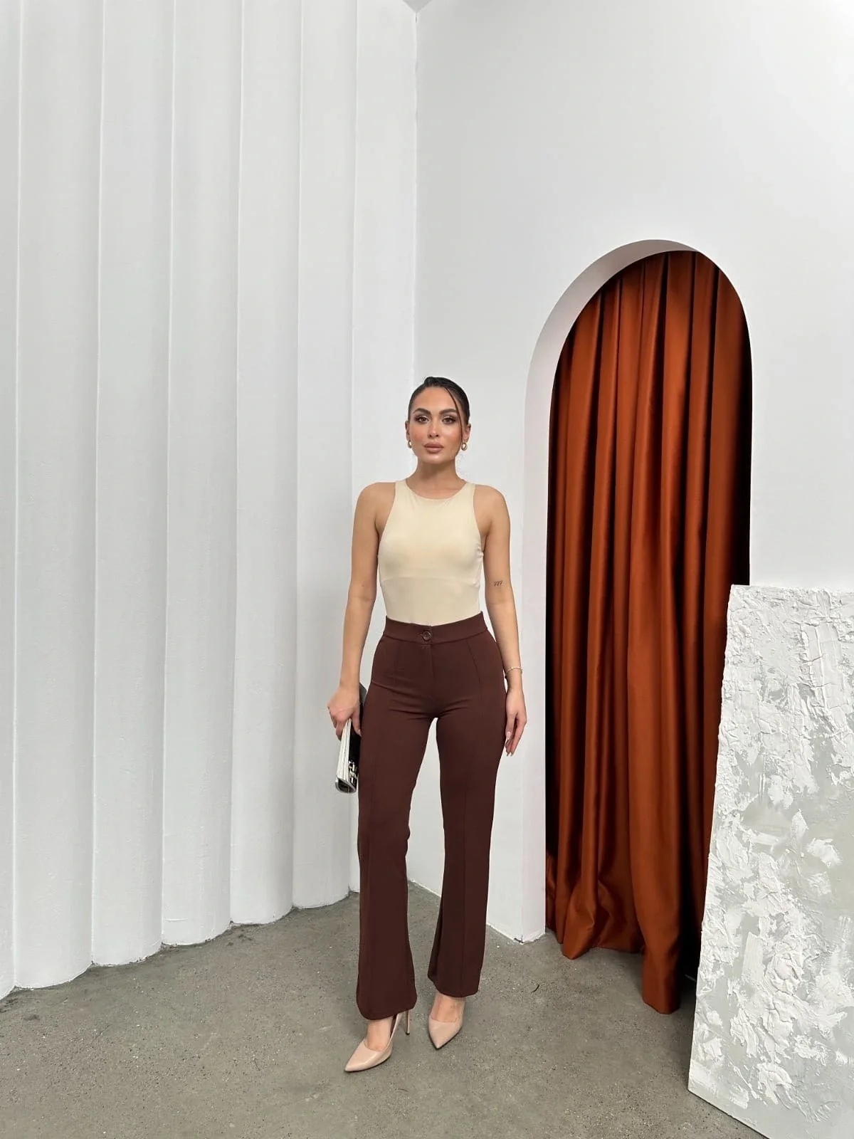 şık ve rahat tasarımıyla öne çıkan Düğmeli Palazzo pantolon kahve p170091, gardırobunuzun vazgeçilmezi olmaya aday!