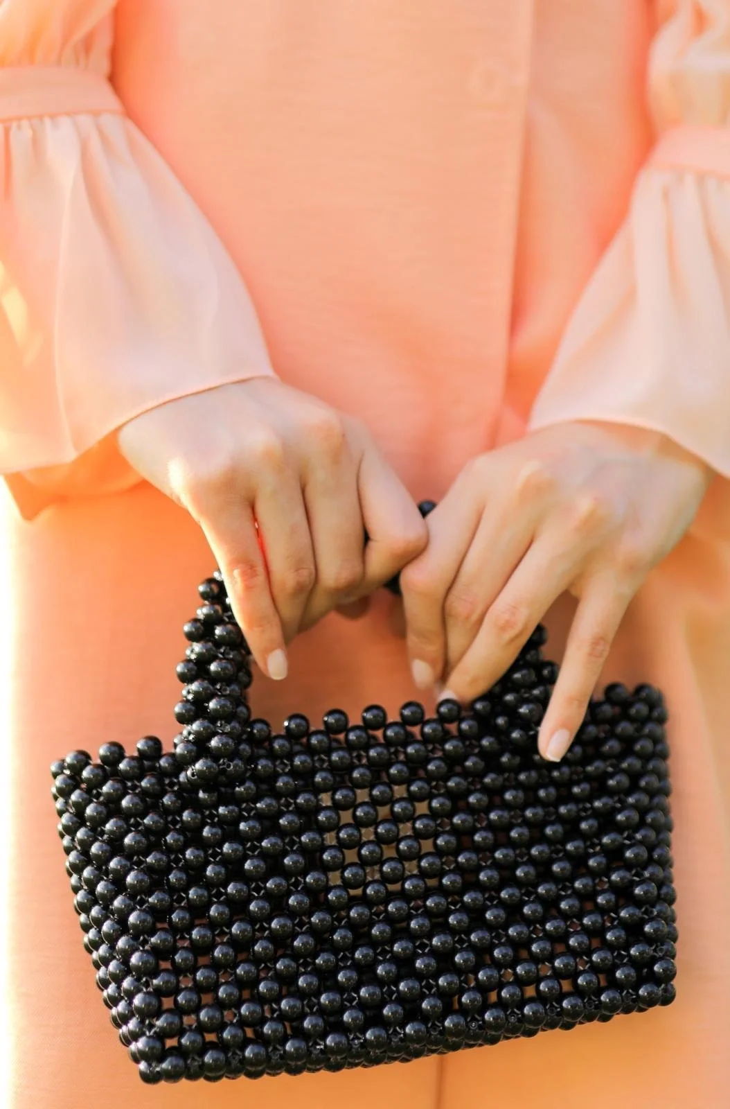 El yapımı incili yuvarlak kol çanta siyah, zarif ve şık bir görünüm sunar.