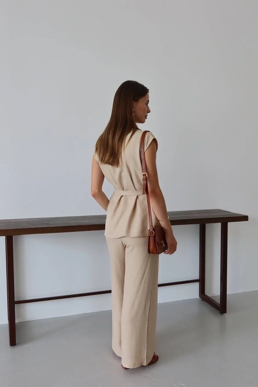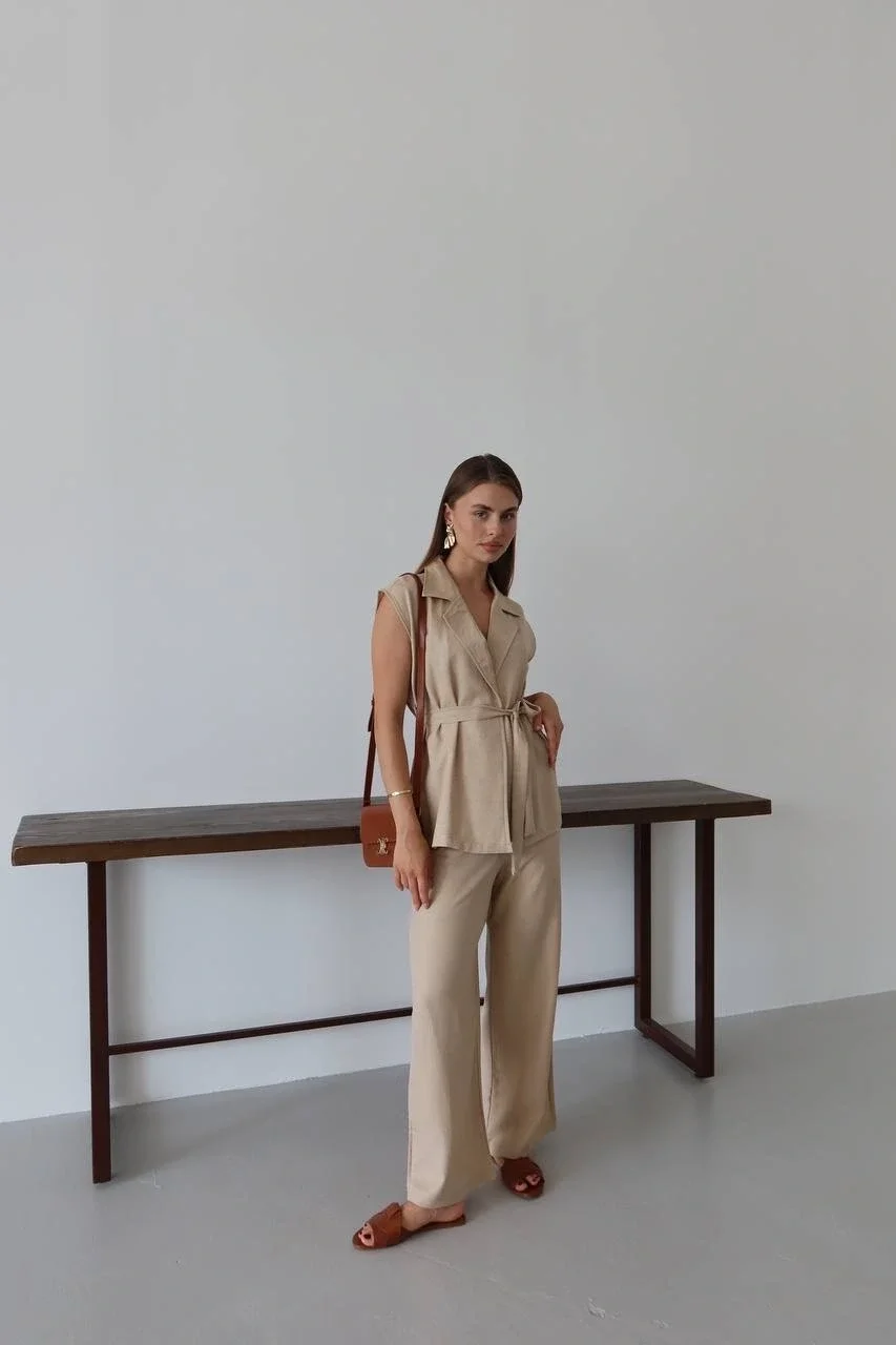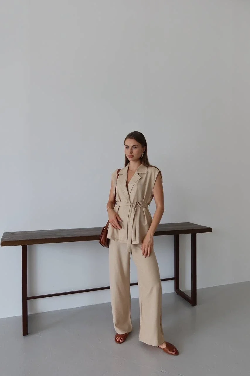 keten yelek pantolon takım bej rengi ile şıklığı ve rahatlığı bir arada sunuyor.