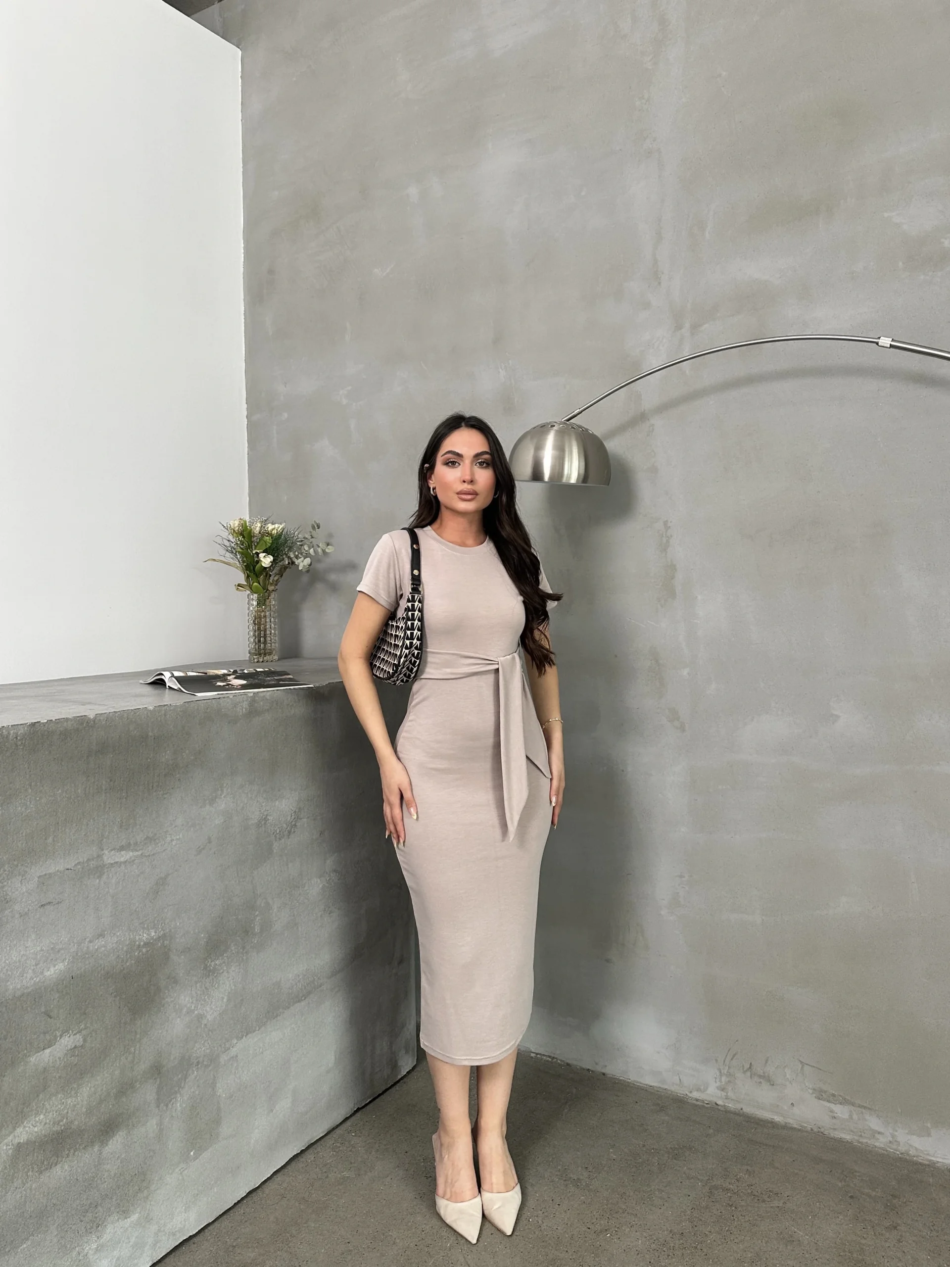 Bu bej renkli Kuşaklı Model Esnek Kumaşlı Elbise, şıklığı ve rahatlığı bir arada sunuyor.