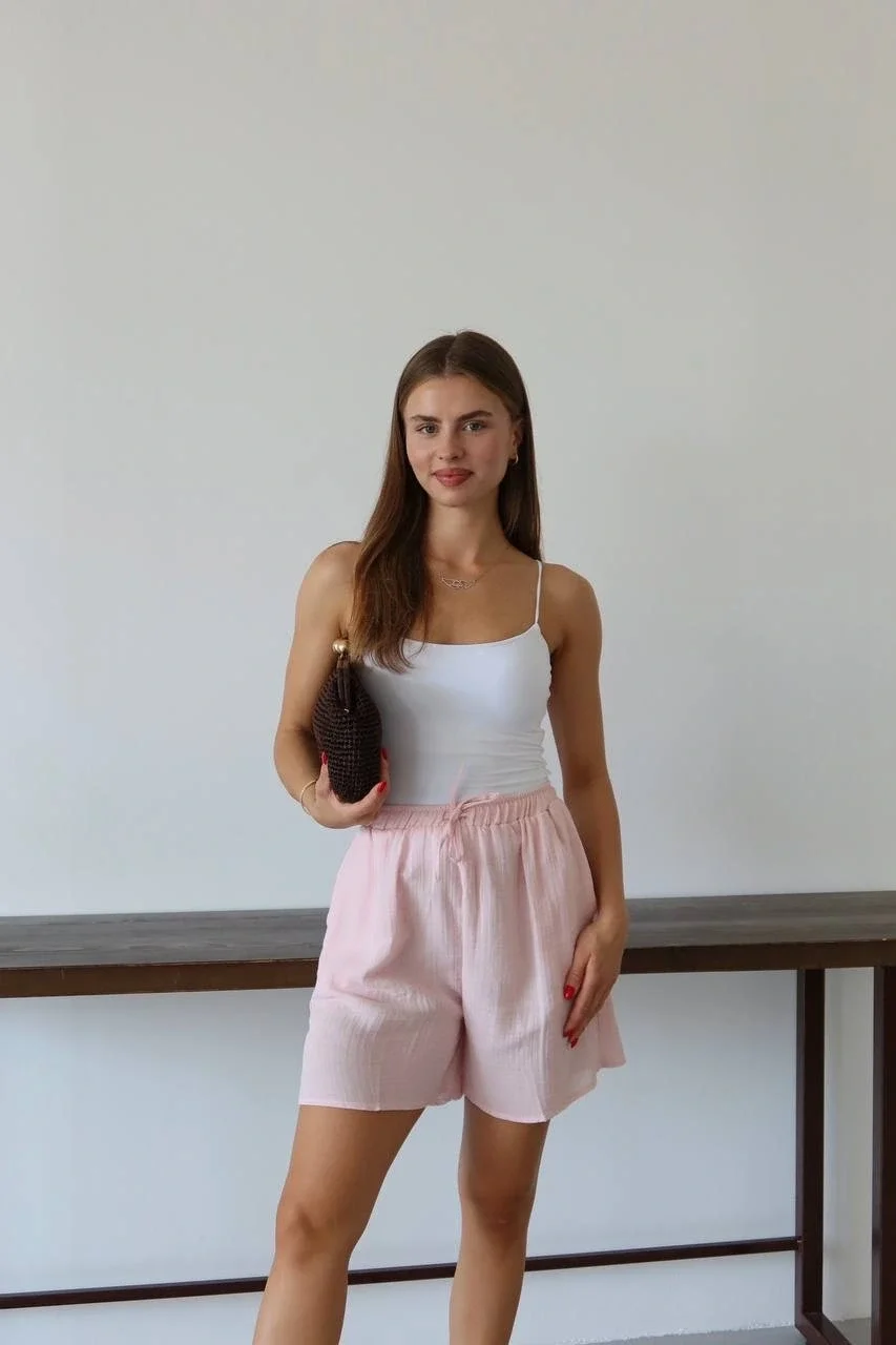 Bu şık pembe şort, rahatlığı ve şıklığı bir arada sunuyor. %100 pamuklu müslin kumaştan üretilmiştir ve sıcak havalarda serin kalmanızı sağlar. Bağcıklı detayı sayesinde belinize göre ayarlayabilir ve istediğiniz şekilde kullanabilirsiniz. Zarif tasarımı ile günlük hayatta ve tatilde rahatlıkla tercih edebilirsiniz.