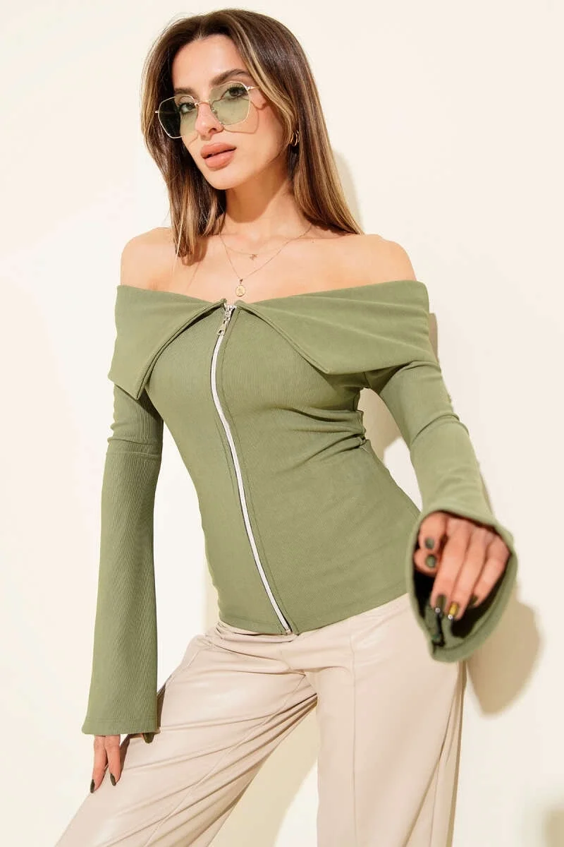 Omzu Açık Fermuarlı Bluz haki T4330, feminen ve şık bir görünüm arayan kadınlar için ideal bir seçenektir.