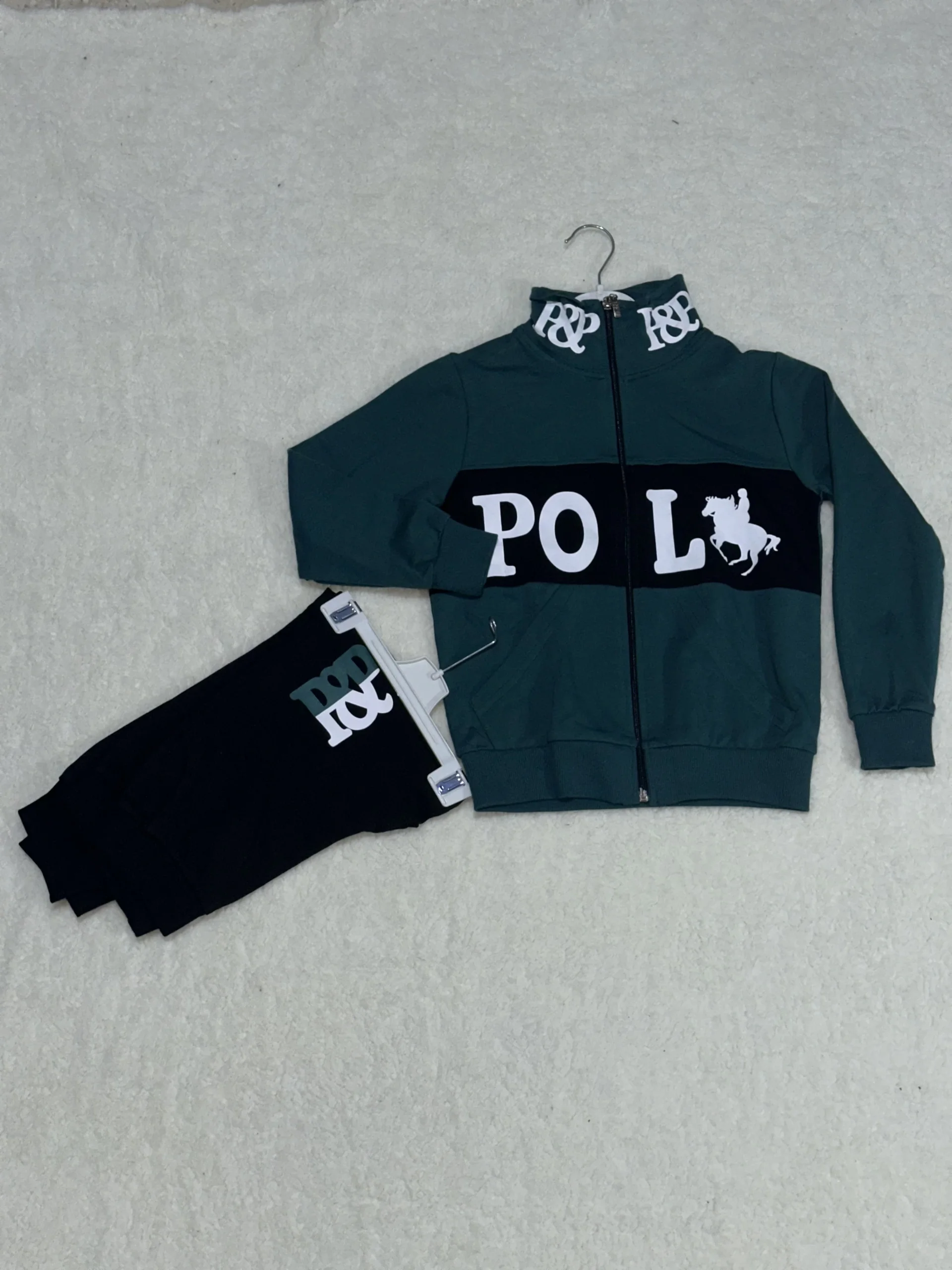 Çocuklar için konforlu ve şık bir seçenek olan siyah petrol yeşili baskılı kanguru cep alt üst eşofman takımı, hareket özgürlüğü sunar.