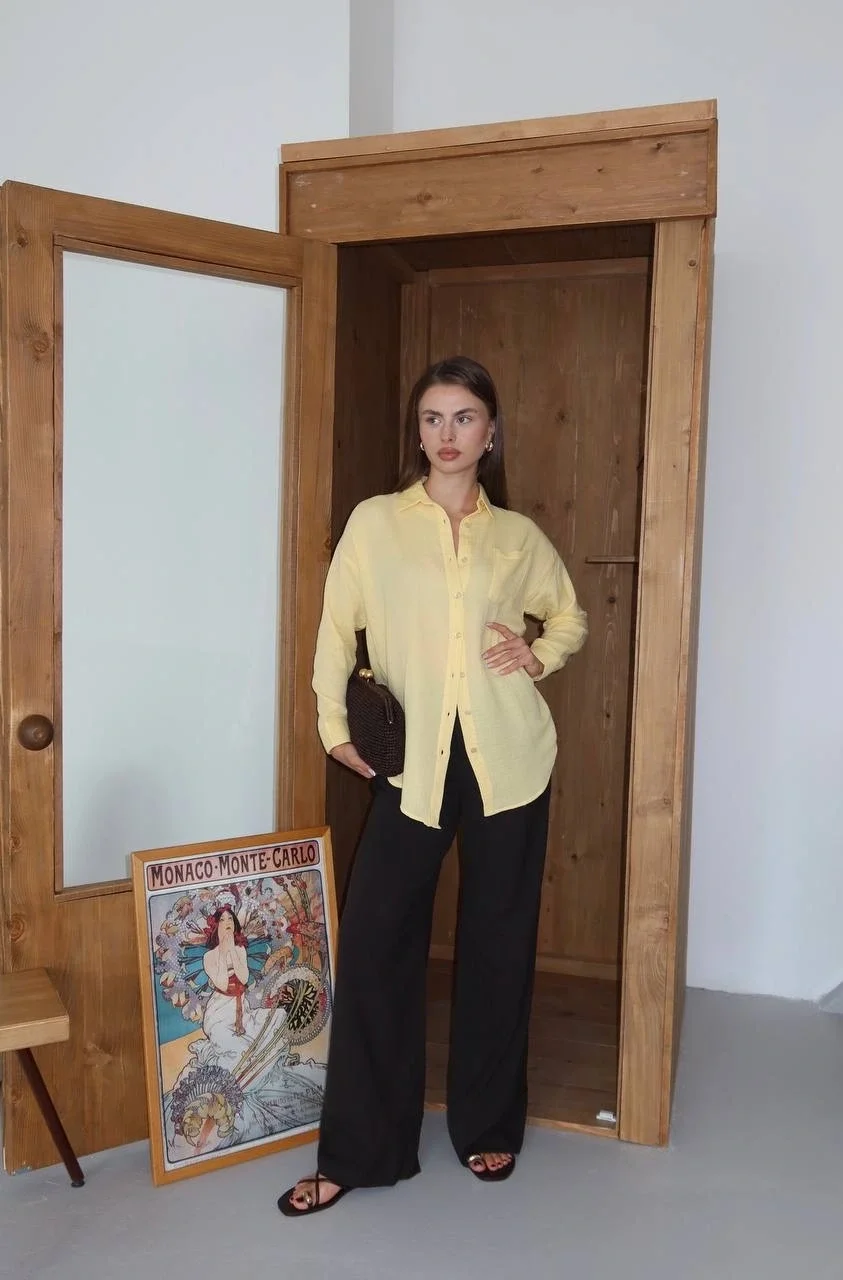 - Sarı rengiyle dikkat çeken gömlek, yaz aylarında ferah ve şık bir görünüm sunar.