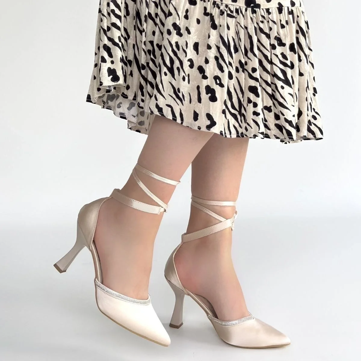 Tenja Bej Saten Bilekten Bağcıklı Topuklu Ayakkabı