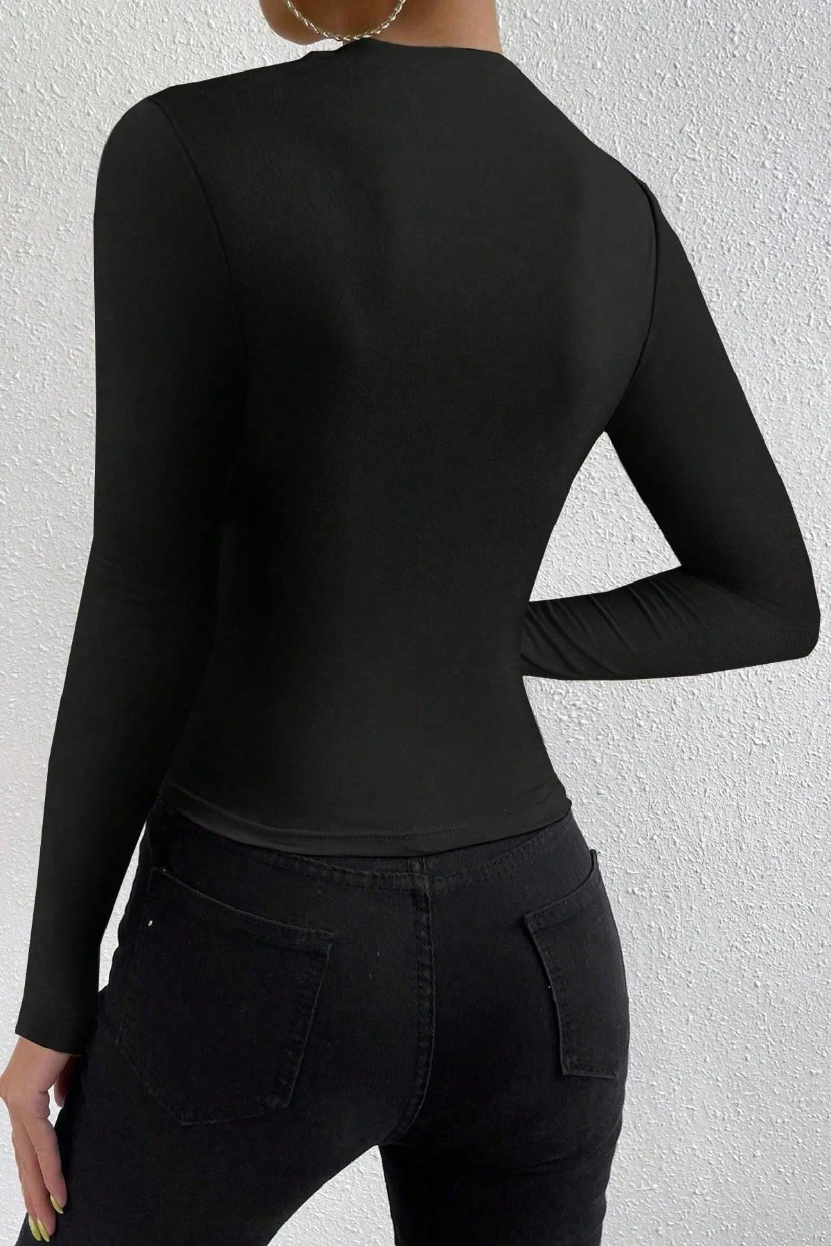 Uzun kollu yapısı, serin bahar ve sonbahar günlerinde konforlu bir kullanım sunarken, siyah rengin zamansız şıklığı her tarzla kolayca uyum sağlar.