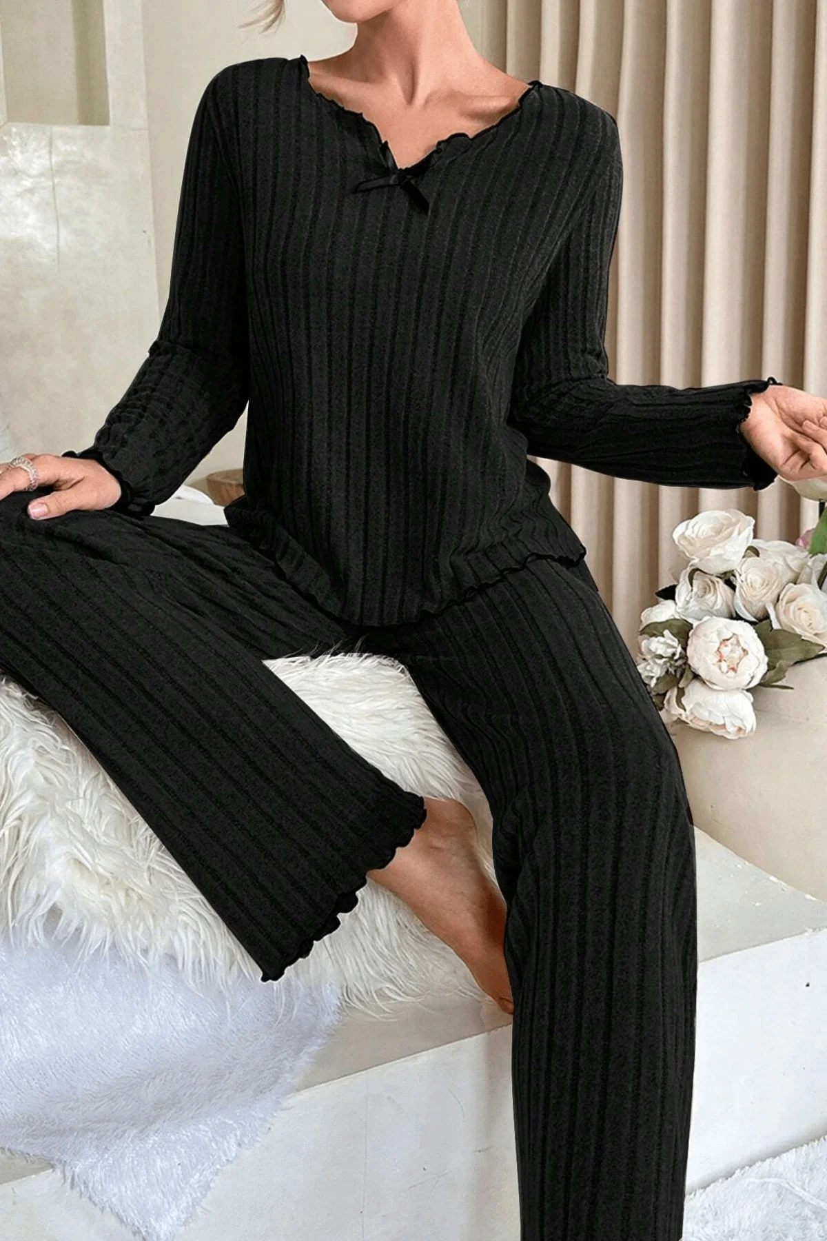 Klasik siyahın zarafetini kırmızı detayların enerjisiyle buluşturan bu kadın pijama takımı, evde geçirdiğiniz her ana sofistike bir dokunuş katar.Kadın pijama takımı koleksiyonlarının en zarif parçalarından biri olan bu model, şık görünümüyle dikkat çekerken, rahat kalıbı ve yumuşak kumaşıyla konforu ön planda tutar.Uzun kollu üst kısmı, kırmızı biyelerle çevrelenmiş hatları sayesinde modern bir görünüm kazanır.Ön kısmında yer alan dekoratif fiyonk süslemeleri feminen bir hava yaratırken, şık yakası tasarıma zarif bir karakter kazandırır.Kumaşın esnek yapısı vücudu sıkmadan doğal bir uyum sağlar ve gün boyu konfor sunar.Alt parçası rahat kesimiyle özgürce hareket etmenizi sağlar.Kadın ev giyimi kategorisinde fark yaratan bu model, sabah keyiflerinde, akşam film saatlerinde veya hafta sonu rahatlığında size hem sıcaklık hem de şıklık sunar.Dayanıklı kumaşı formunu uzun süre korur, defalarca yıkandığında bile ilk günkü canlı görünümünü kaybetmez.Sonbahar ve kış aylarında konforu, zarafeti ve sıcaklığı bir arada yaşamak isteyen kadınlar için mükemmel bir tercihtir.Öne çıkan özellikler:Kadın pijama takımı – iki parçalı, uzun kollu tasarımKırmızı biyeler ve dekoratif fiyonk detaylarıyla şık görünümYumuşak ve esnek kumaş dokusuRahat kesim alt parça ile maksimum konforEv giyimi, uyku ve dinlenme anları için idealDayanıklı kumaş ve kaliteli dikişSonbahar ve kış sezonuna uygun sıcak tutan yapı]]>