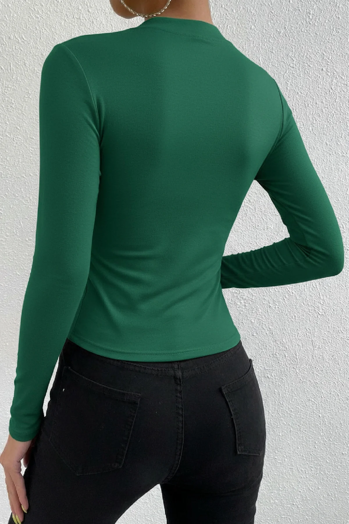 Modern çizgilerle tasarlanmış Kadın Yeşil Belden ve Boyundan Büzgü Detaylı Uzun Kollu Bluz, doğadan ilham alan tonuyla sade ama sofistike bir zarafet sunar.Boyun ve bel kısmındaki zarif büzgü detayları vücuda oturan formu desteklerken, feminen bir siluet oluşturur.Esnek, dökümlü kumaş yapısı sayesinde gün boyu konforlu bir kullanım sağlar.Yeşilin huzurlu ama etkileyici tonu, her mevsimde kullanılabilecek taze bir görünüm kazandırır.Bahar ve sonbahar dönemlerinde tek başına ya da ceketlerle kombinlenebilir, hem ofis hem günlük kombinlere kolayca uyum sağlar.Uzun kollu yapısı ve zarif kesimiyle modern bir sadeliği yansıtır.Bel ve boyun bölgesindeki büzgü detayları, bluzu klasik parçalardan ayıran şık bir dokunuş sunar.Şıklığı rahatlıkla buluşturan bu parça, her tarza kolayca adapte olur.Öne Çıkan ÖzelliklerRenk: YeşilKumaş: Esnek, dökümlü ve nefes alabilirYaka Tipi: Hafif asimetrik, büzgü detaylıKol Tipi: Uzun, dar kesimDetay: Boyun ve bel kısmında büzgü, vücuda oturan tasarımSezon: Bahar / SonbaharStil: Şık – Feminen – GünlükStil ÖnerileriGündüz Şıklığı: Yeşil bluzu krem veya bej pantolonla kombinleyin, altın takılarla tamamlayın.Ofis Kombini: Beyaz veya siyah yüksek bel pantolon ve stiletto ayakkabılarla modern bir görünüm yakalayın.Akşam Şıklığı: Deri etek veya saten pantolonla birleştiğinde zarif bir kontrast yaratın.Günlük Rahat Kombin: Jean pantolon ve sneaker’larla sade ama etkileyici bir görünüm elde edin.Neden Tercih Etmelisiniz?Yeşilin doğal ve ferah tonuyla modern bir zarafet sunar.Büzgü detayları vücut formunu zarifçe ortaya çıkarır.Esnek kumaş yapısı konfor ve şıklığı bir araya getirir.Günlükten geceye geçişi kolaylaştıran çok yönlü bir tasarımdır.Kadın Yeşil Belden ve Boyundan Büzgü Detaylı Uzun Kollu Bluz, doğanın tazeliğini modern çizgilerle buluşturuyor.Zarif, sade ve güçlü bir stil için ideal bir seçim!]]>