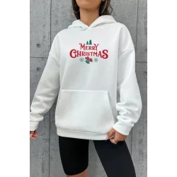 Üç İplik Kapşonlu ön Ve Arka Baskılı SweatShirt Hoodie- Beyaz